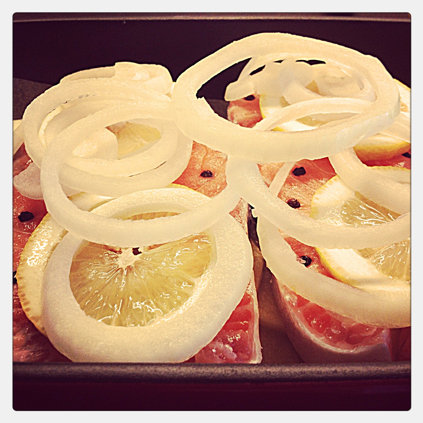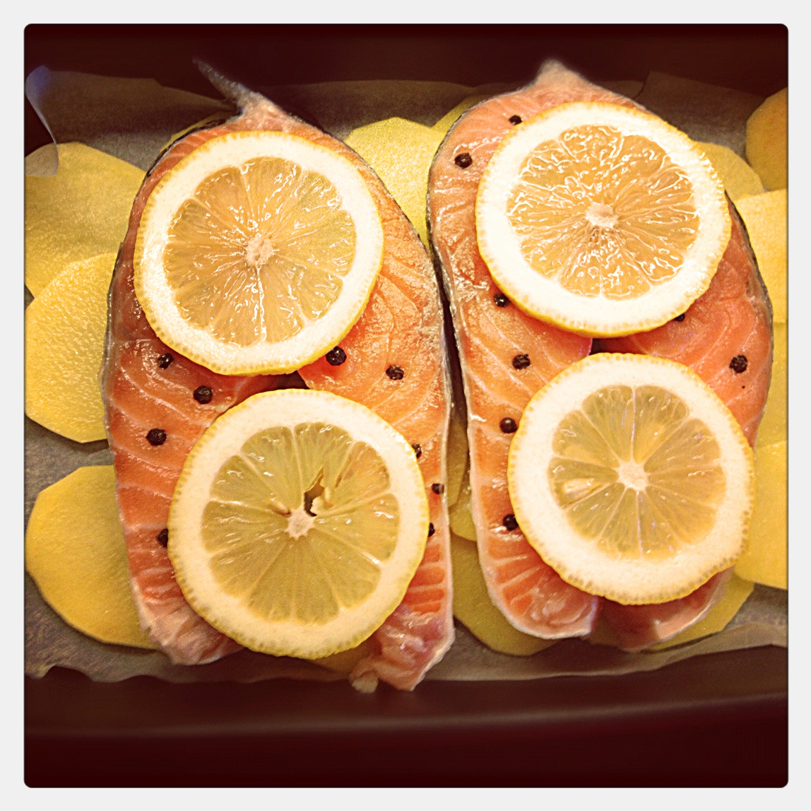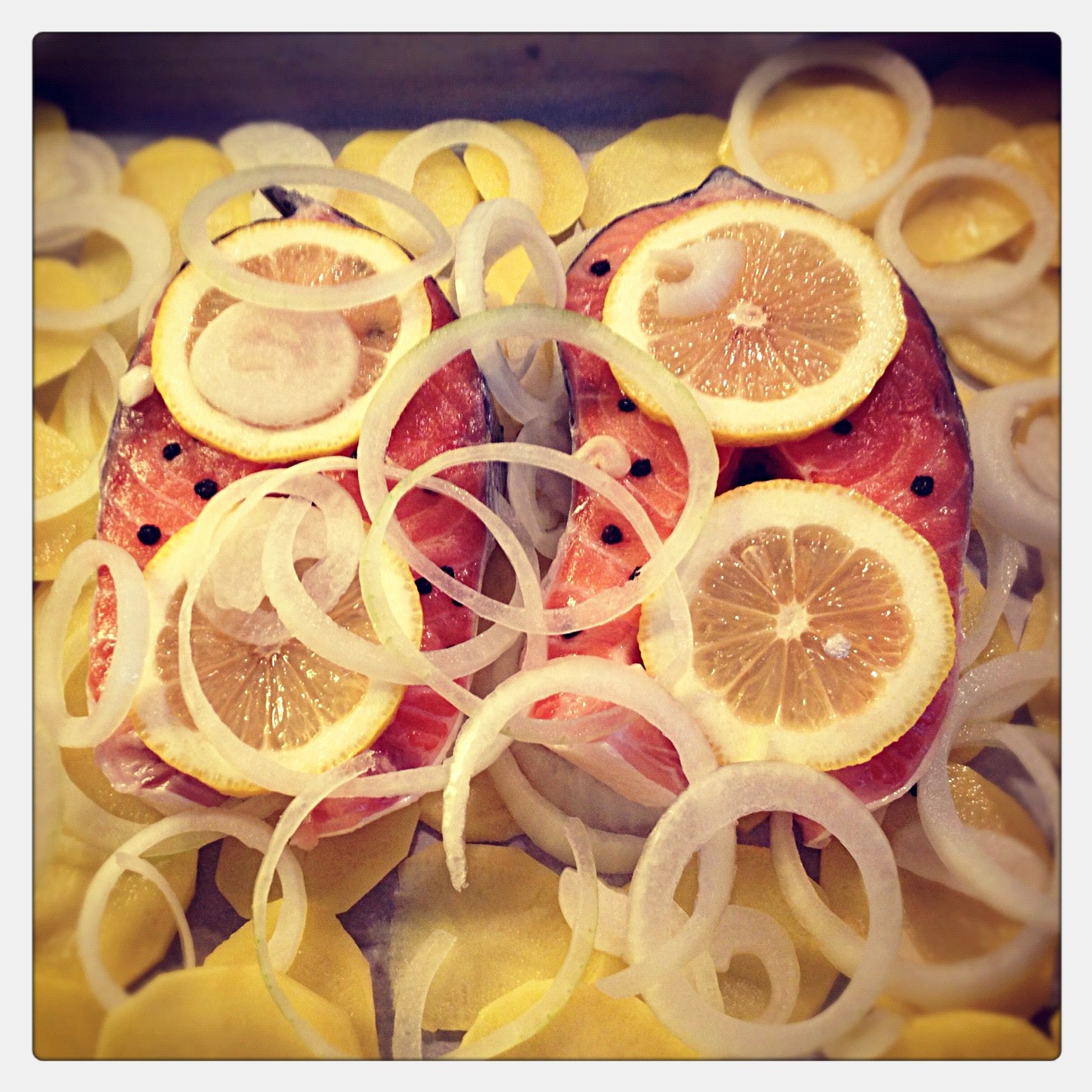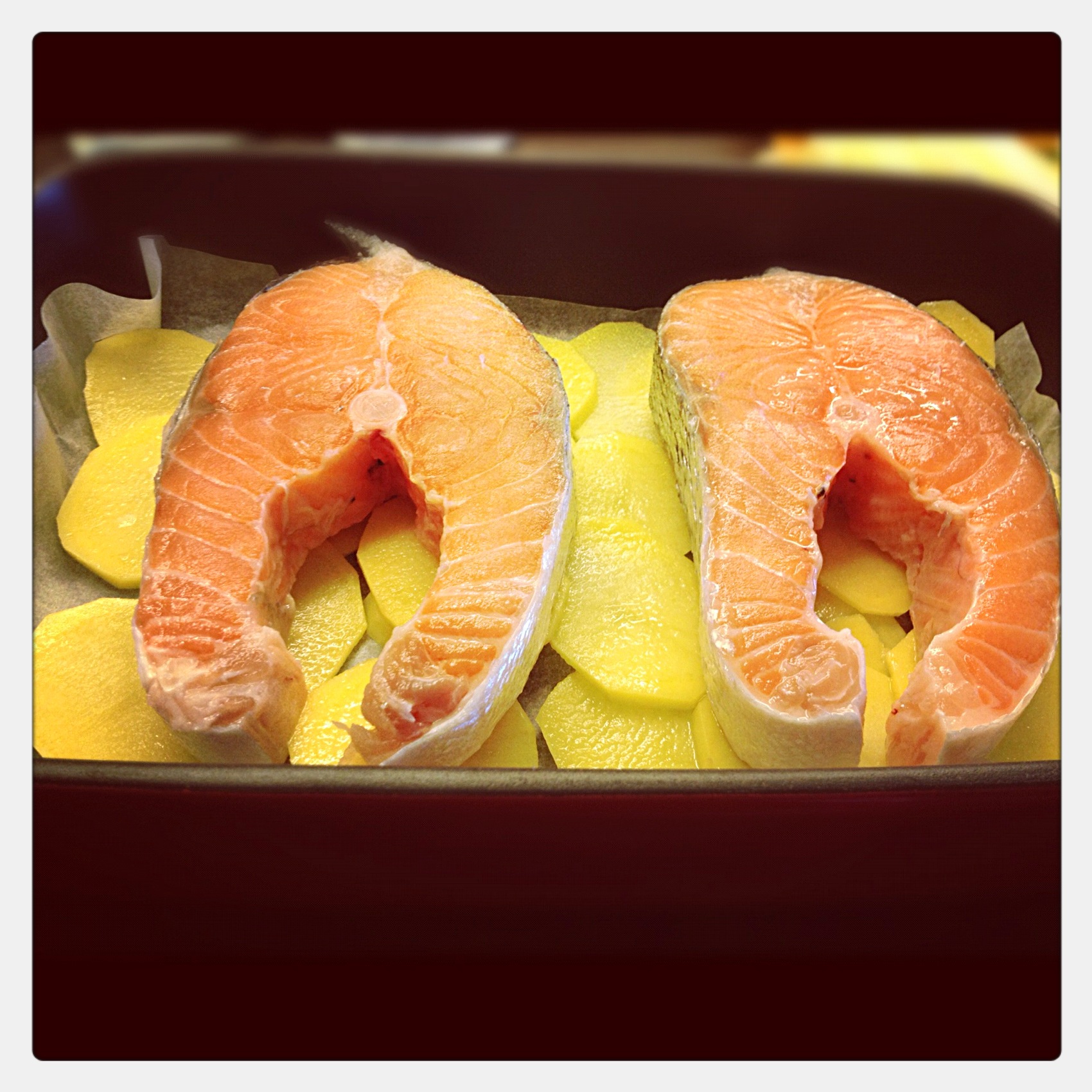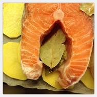 Ben somonları ve patatesleri tuzlayıp karabiberleyip borcama diziyorum.2 adet limon suyu+1 portakal suyu+sızma zeytinyağı+6diş ezilmiş sarımsak+defne yaprakları+ince kesim maydanozlarla sos hazırlayıp borcama döküyorum ve üzerine yağlı kağıt sıkıştırıp 200 C de 45 dk pişiriyorum.Sonuç harika:)