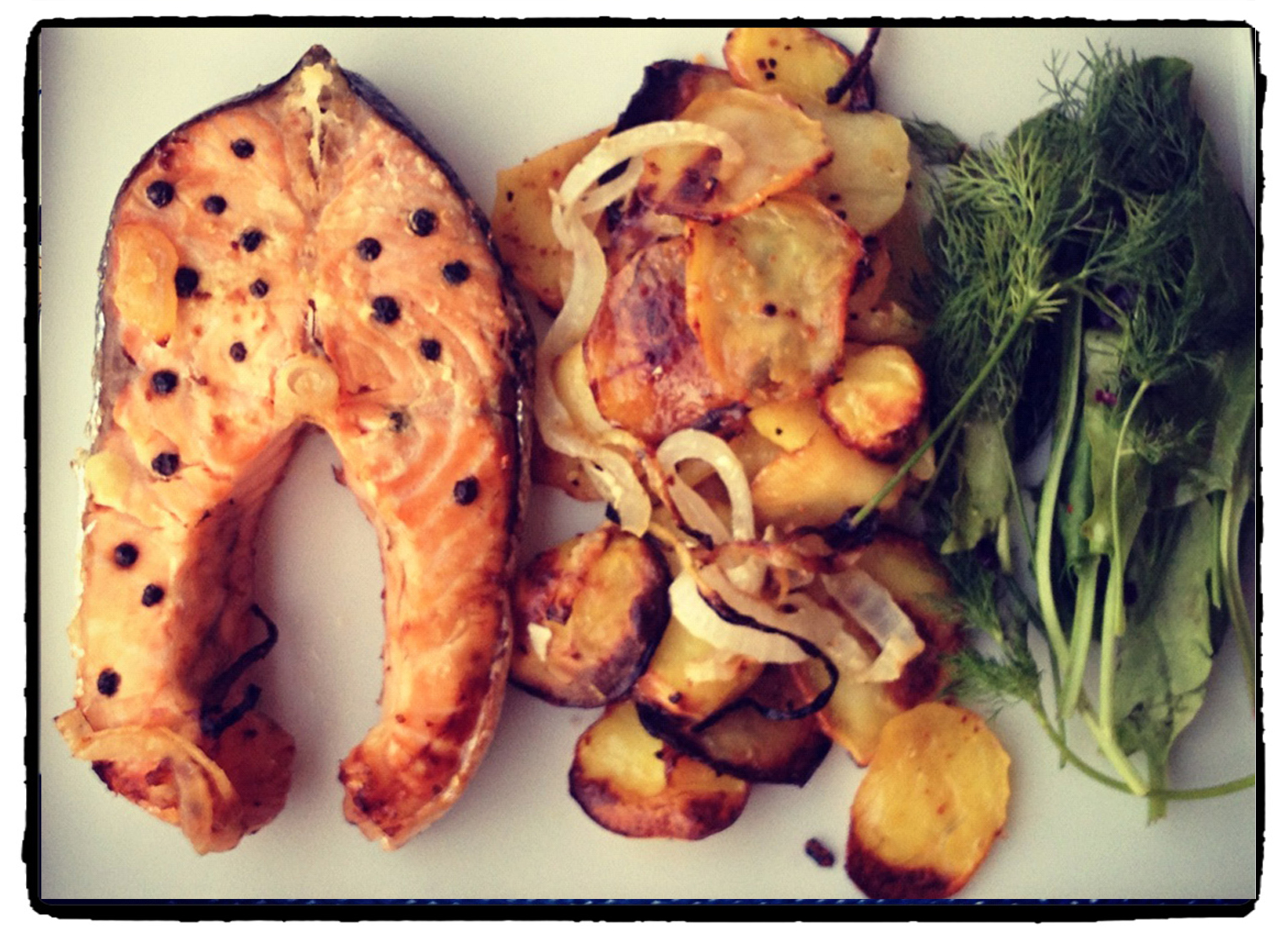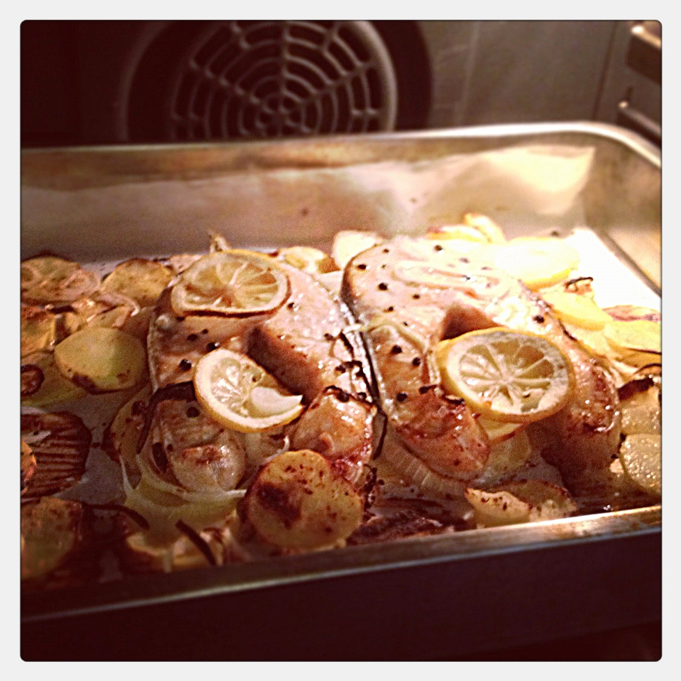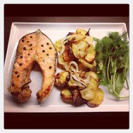 Soğanlar ve patatesler ince oldukları için çabuk kızarabilirler, ara sıra çevirmeyi unutmayın. İyi pişmiş sevenler somonu da çevirerek pişirebilirler.