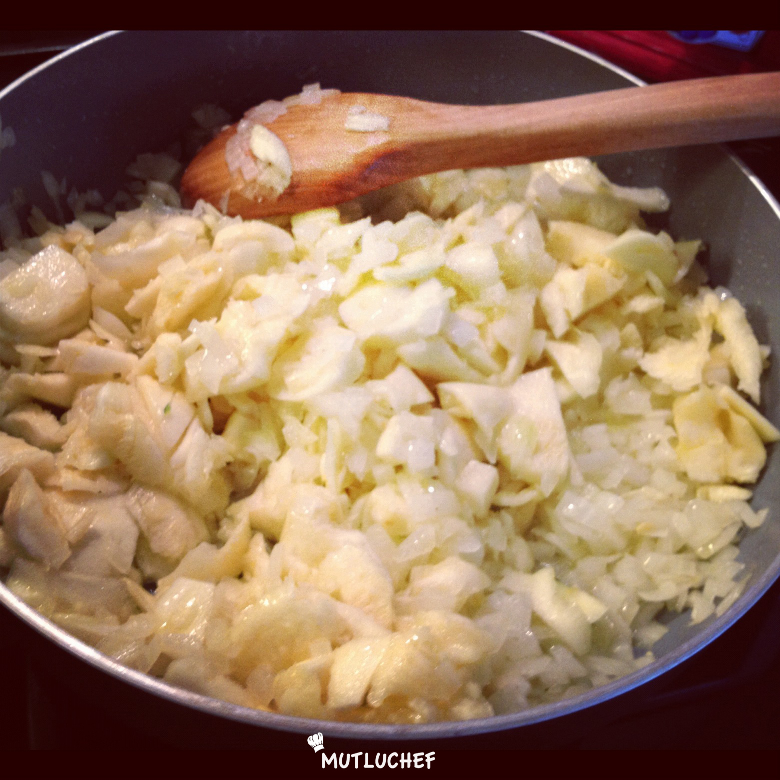 Soğanları ve kabakları soyun ve küçük küçük doğrayın. Soğanları sıvıyağda pembeleşene kadar iyice kavurun. Doğradığınız kabakları soğanlara ekleyin ve kabaklar yumuşayıp eriyene kadar kavurmaya devam edin.
