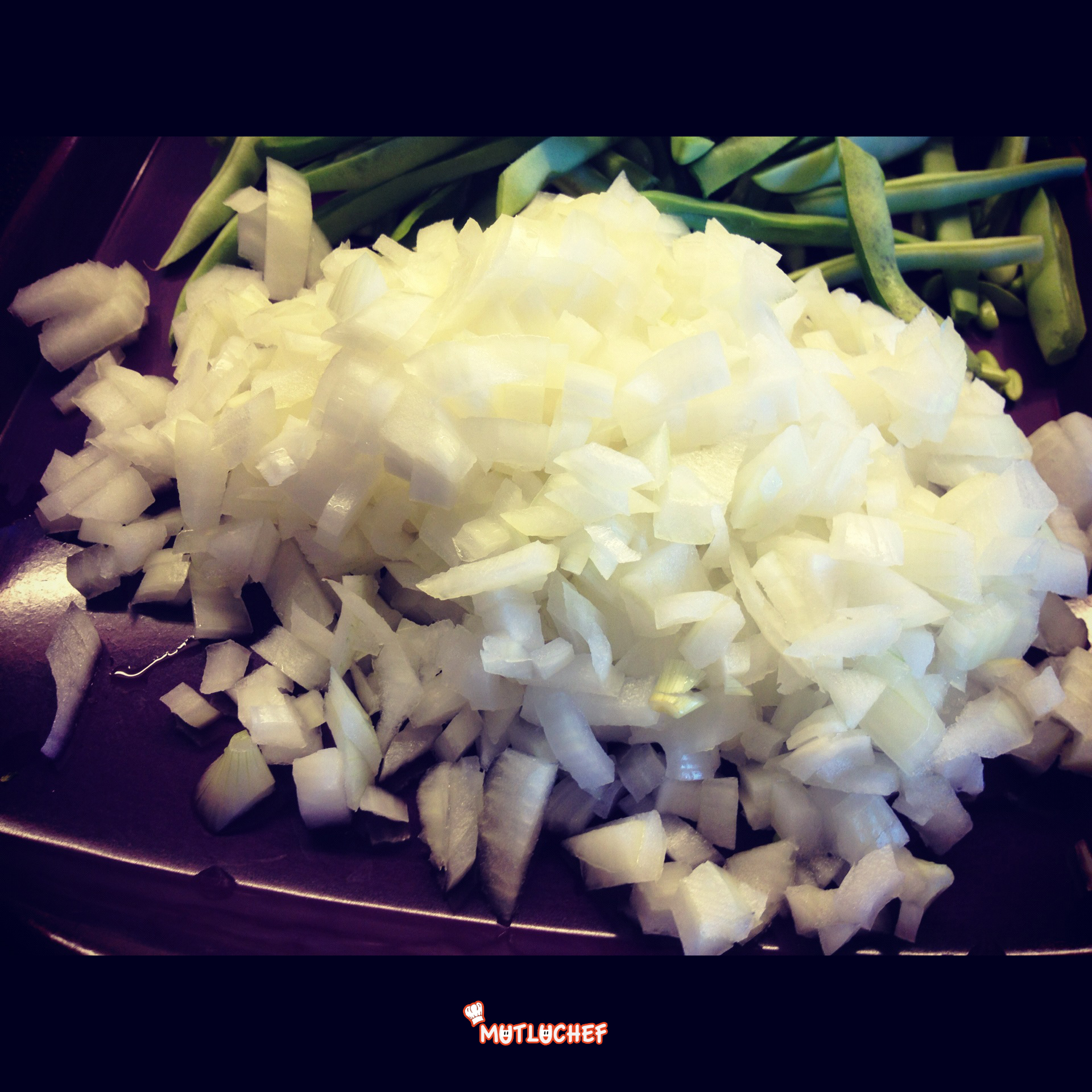 Sebzelerinizi yıkayın ve sularını süzdürün. Fasülyelerin baş kısımlarını kesin ve önce boylamasına sonra enlemesine ortadan ikiye bölün. Boyları kısa olanları yalnız boydan bölerek bırakabilirisiniz. Güzel bir görüntü için hepsinin eşit boyda olmasını sağlayabilirsiniz. Soğanın kabuğunu soyun ve küçük küçük doğrayın.
