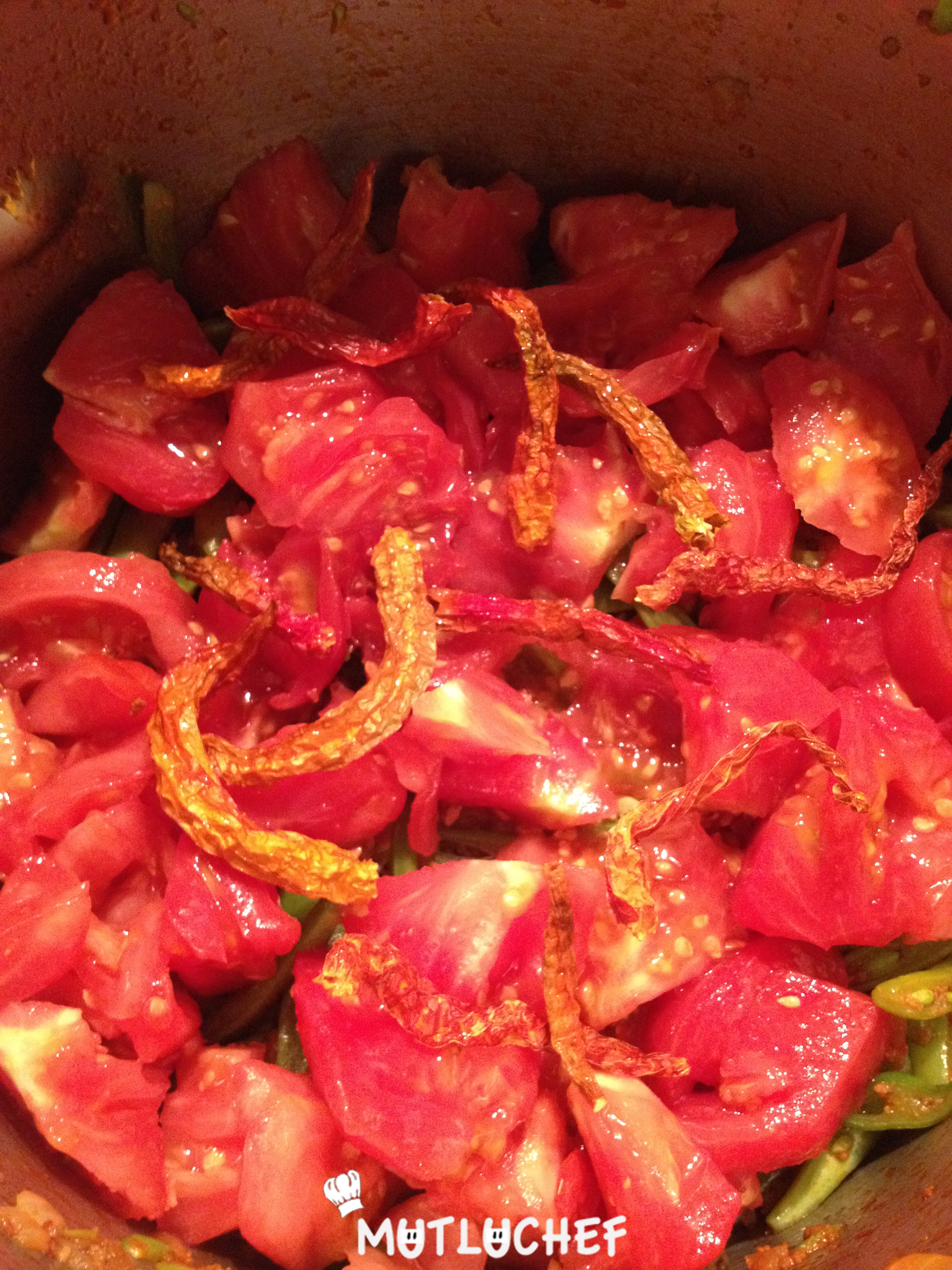 Kurutulmuş domatesleri doğrayın ve ekleyin. Taze domatesleri soyun iri küler halinde doğrayın ve fasülyelerin üzerine dizin. En üste yıkadığınız ve saplarını ayıkladığınız kurutulmuş acı biberlerinizi koyun ve ağzını kapatarak pişirin. Benim kullandığım salçalar tuzlu olduğu için tuz eklemedim. Siz kendi tercihinize göre ekleyebilirsiniz.