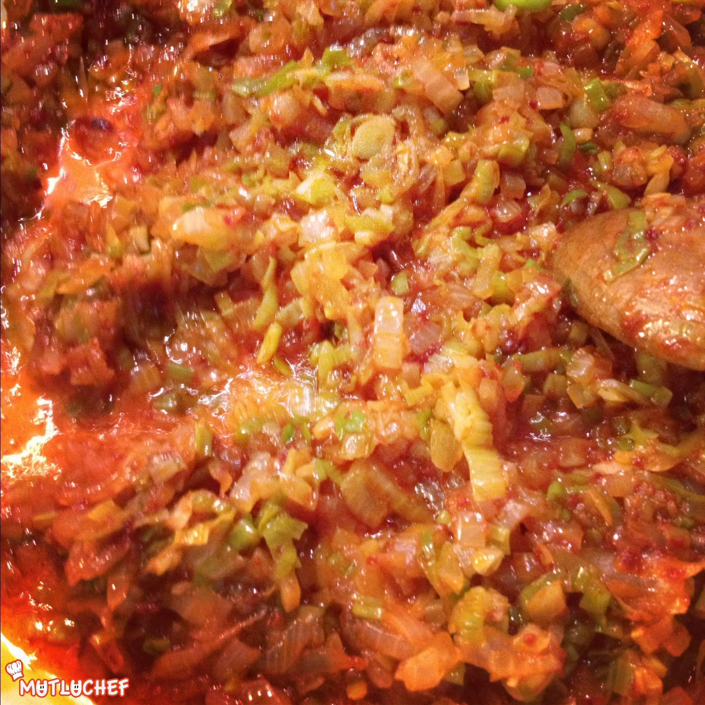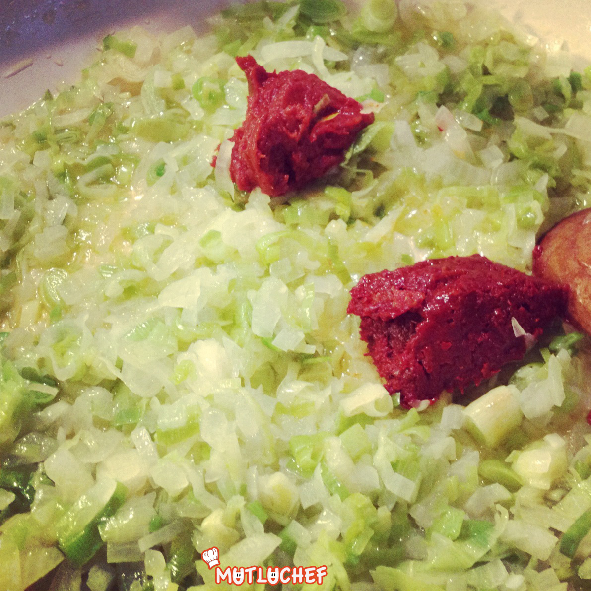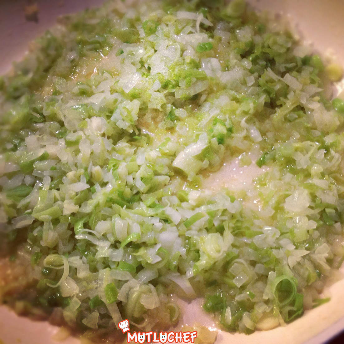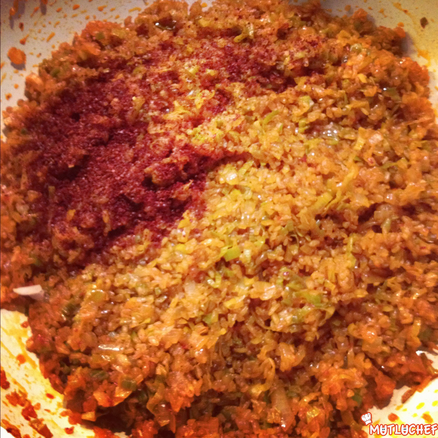 Pilav tenceresine yağları koyun ve kızdırın. Kızan yağa soğanları ve pırasaları ekleyin soğanlar pembeleşene kadar iyice soteleyin. Salçaları ekleyin ve karıştırın. Bulguru ekleyin ve bulgurlar parlayıp şeffaf hale gelene kadar iyice kavurun. Bu arada pırasalar tel tel ayırılacaktır. Pul biberi ekleyin.