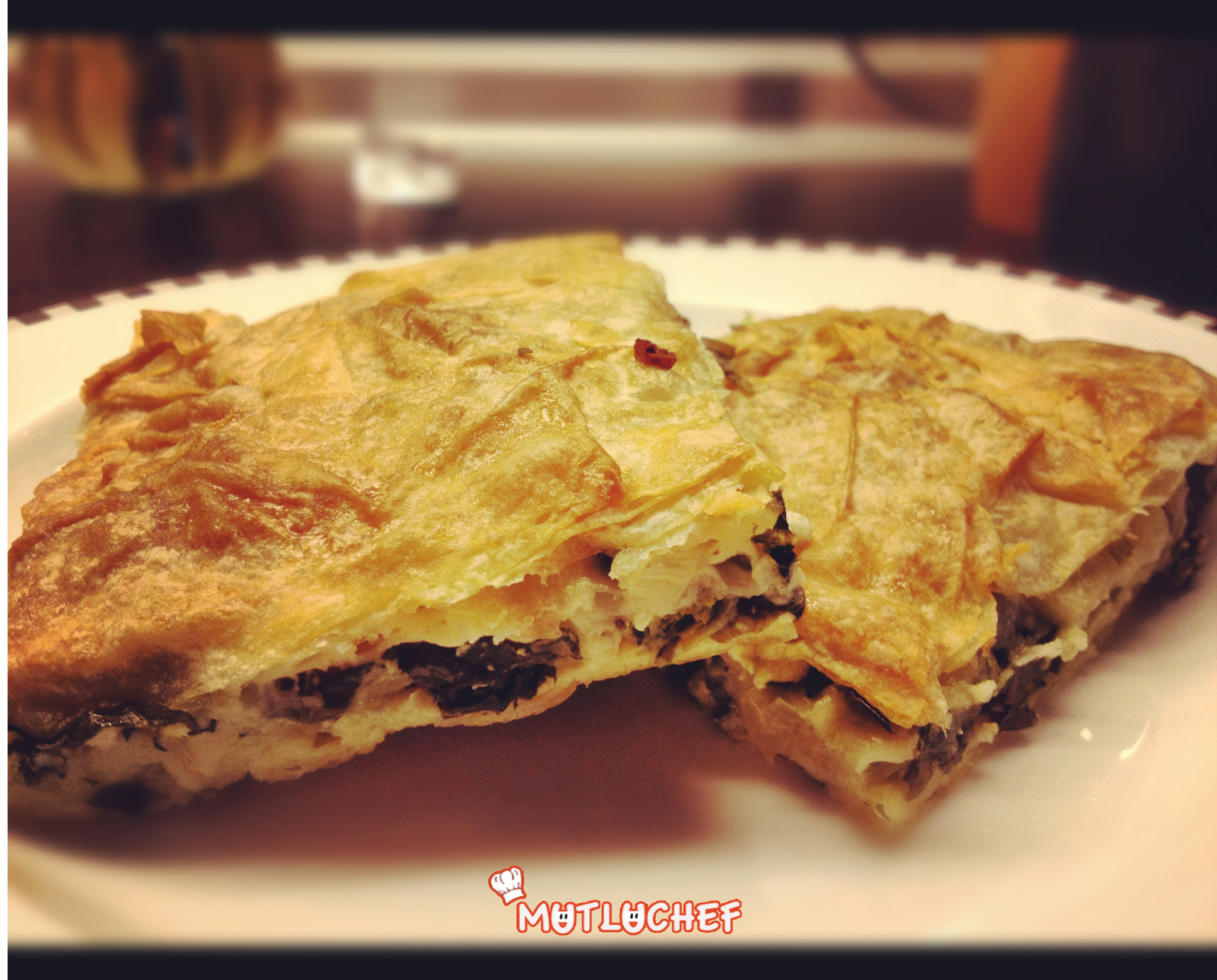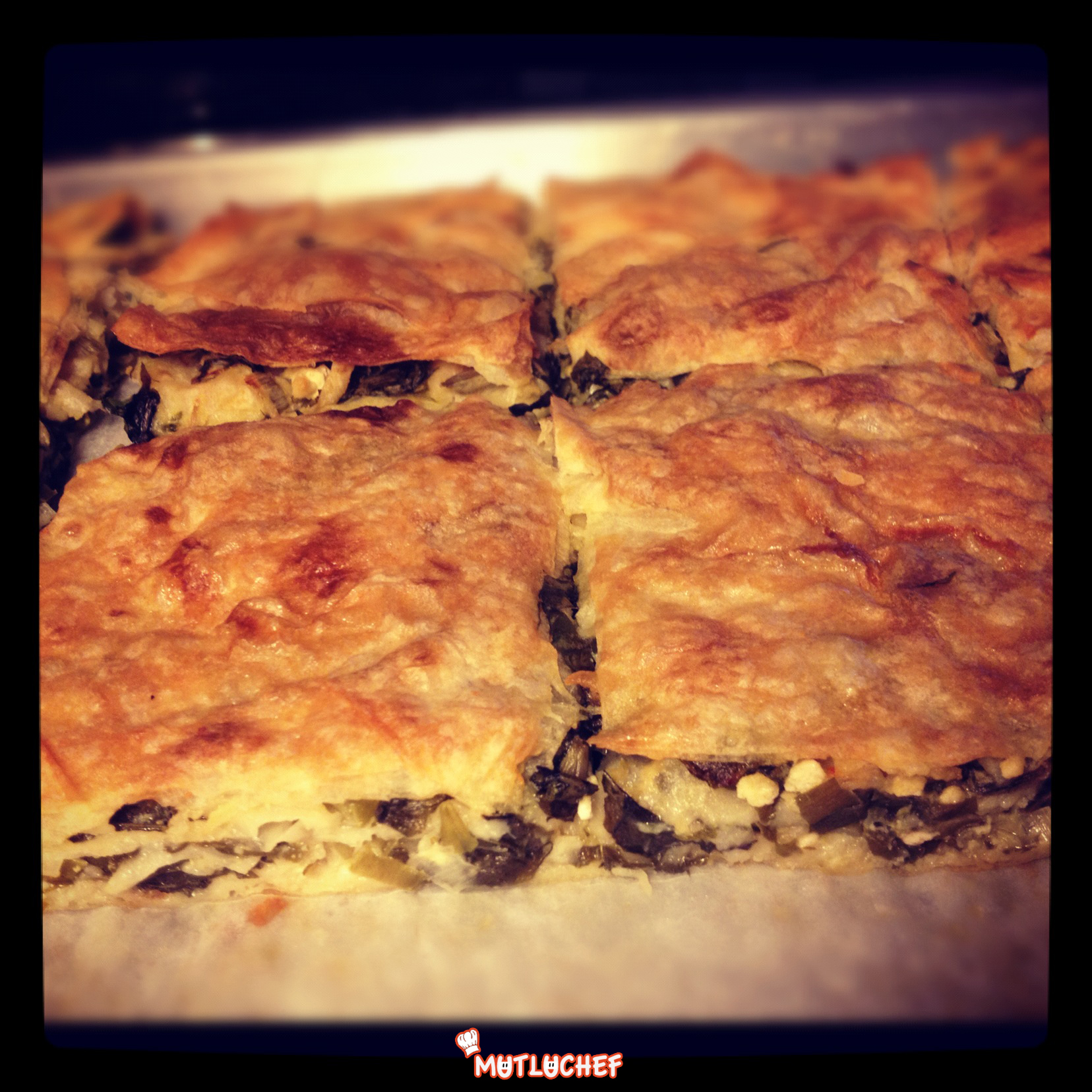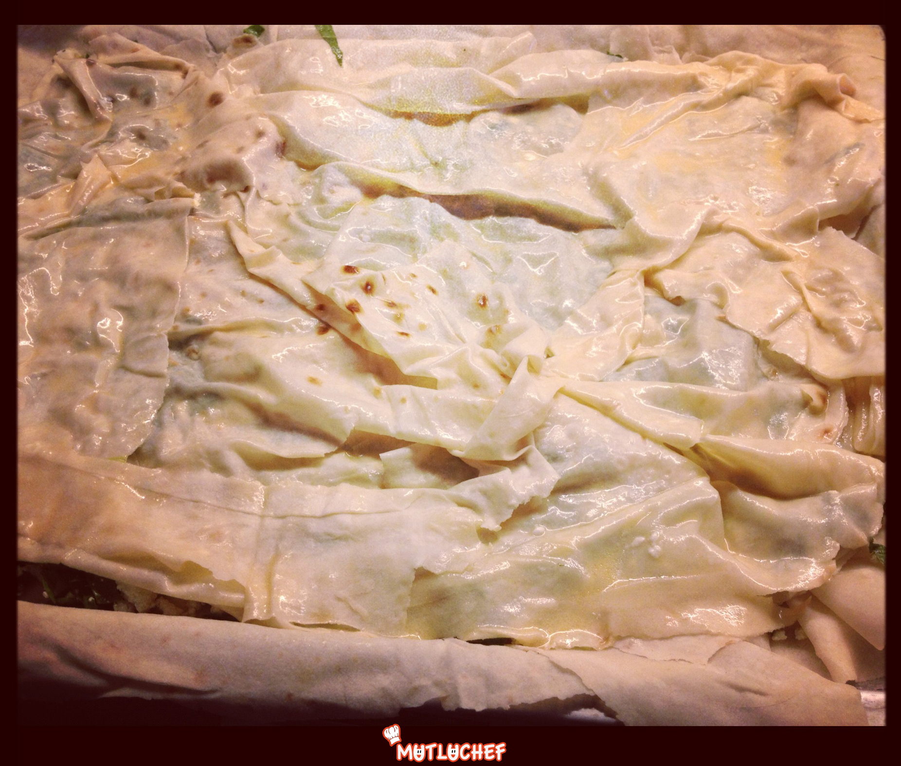 Fırın kabınıza yağlı kağıt serin veya sıvıyağ ile hafif yağlayın. Yumurtalardan birinin sarısını bir kenara ayırın. Akına diğer iki yumurtayı ekleyerek çırpın. Sıvıyağ, süt ve suyu ekleyin ve çırparak iyice karıştırın. Yufkanın bir tanesini tepsiden taşacak şekilde tabana yerleştirin. İçine sıvı harçtan biraz dökün ve yayın.