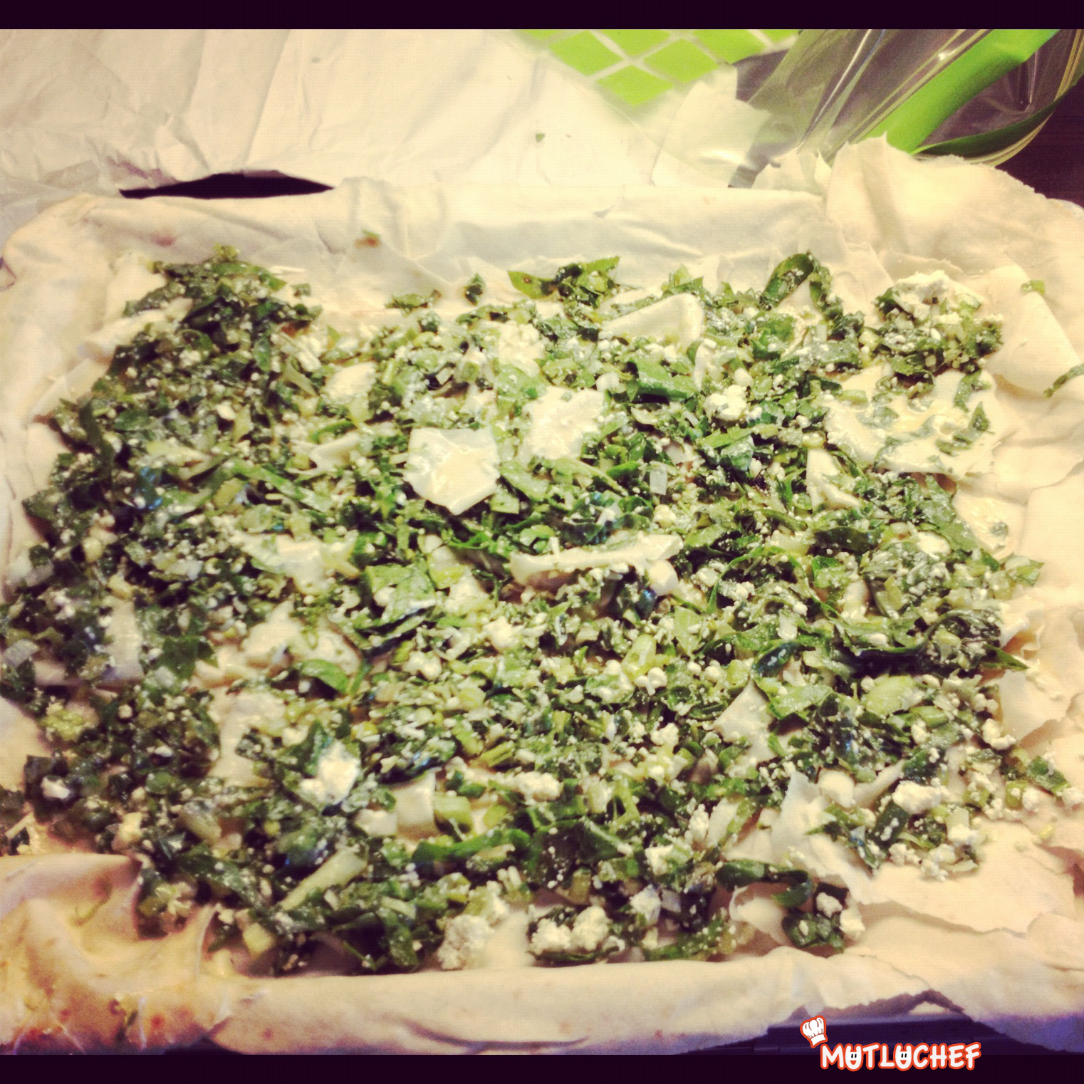 Kalan yufkaları ortadan ikiye bölün ve tek tek sıvı harca batırıp kenarlara taşırmadan tepsiye yayın. Yufkaların iki tanesini (4 yarım parça) bu şekilde yerleştirdikten sonra ortasına otlu harcı dökün ve her yerine eşit olacak şekilde dağıtın. Keçi peynirlerini rendeleyin ve harcın üzerine serpin. Keçi peyniri bulamazsnız herkangi bir sünen peynir de kullanabilirsiniz.