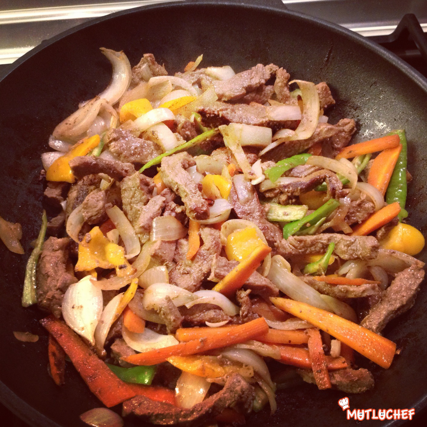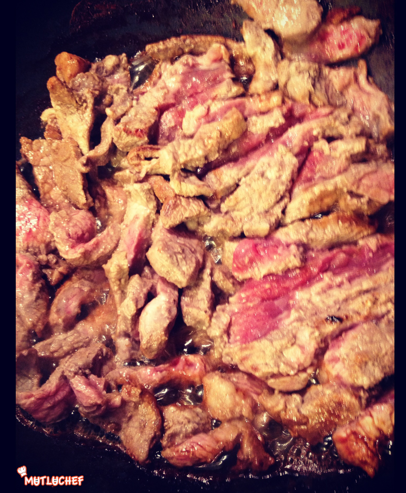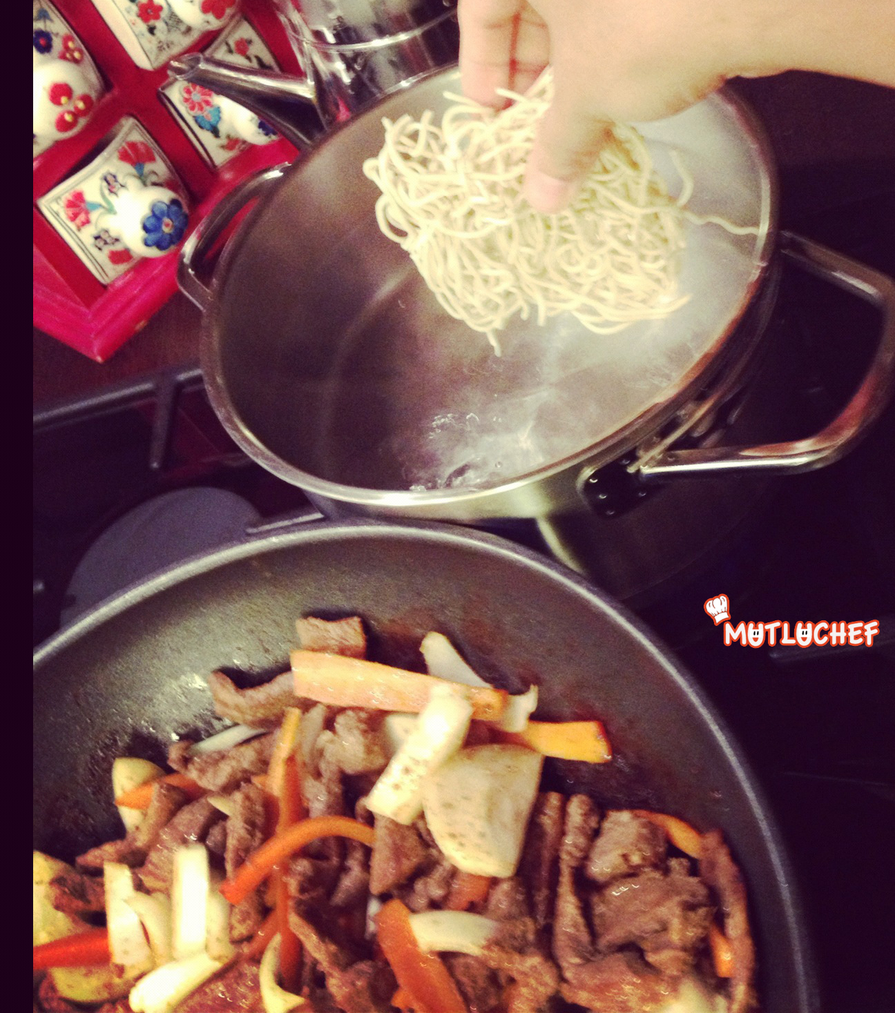 Diğer yandan kaynayan suya noodleları atın. Yapışmaması için noodle düğümlerinin çözülerek birbirinden ayrıldığından emin olana kadar karıştırın. Etlere biberleri de ekleyin ve tavadaki tüm malzemeleri harmanlayarak karıştırın. Ben kolay karıştırmak için çift kaşık kulanıyorum. Böylece sebzeleri zedelemeden alttan üste doğru karıştırmak daha kolay oluyor.  Noodleların pişme süresi 7-9 arasında değişiyor. Siz kendi damak zevkinize göre pişme diriliğini ayarlayabilirsiniz. Yalnız dikkat edin, noodlelları birde wok tavada bifteklerle çevireceğimiz için dağılıp lapa olmaması için aslında en ideal kıvam hafif diri olarak haşlanması…