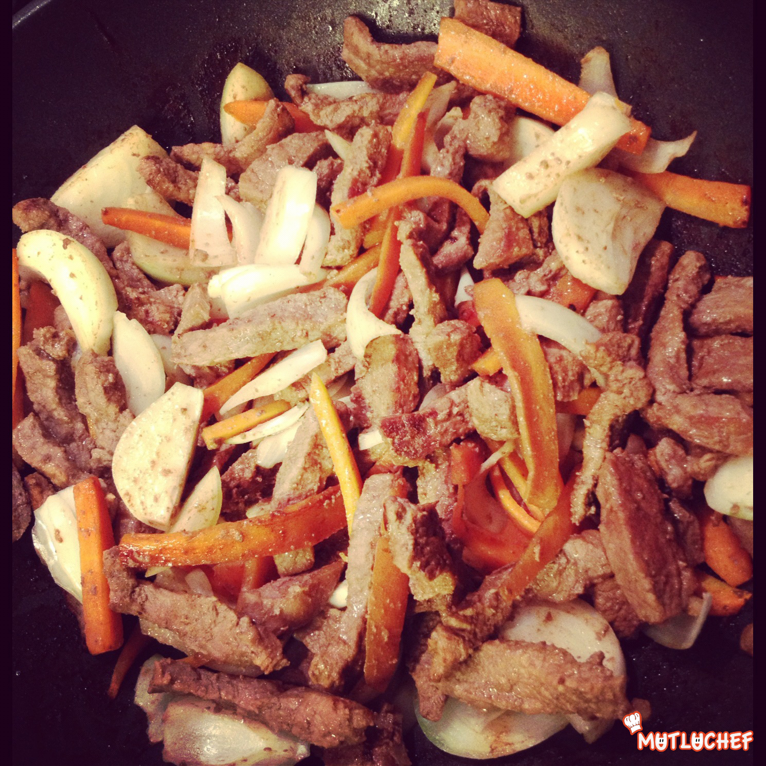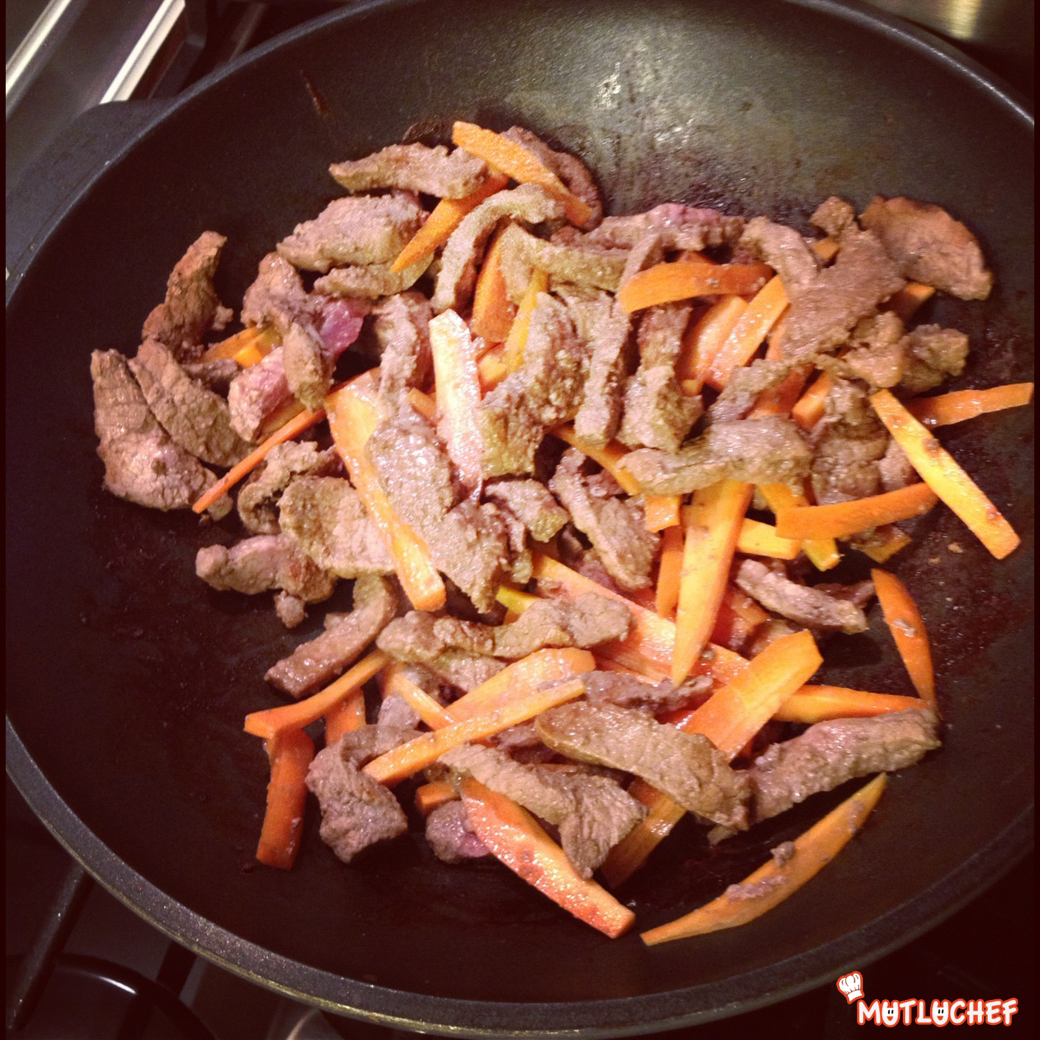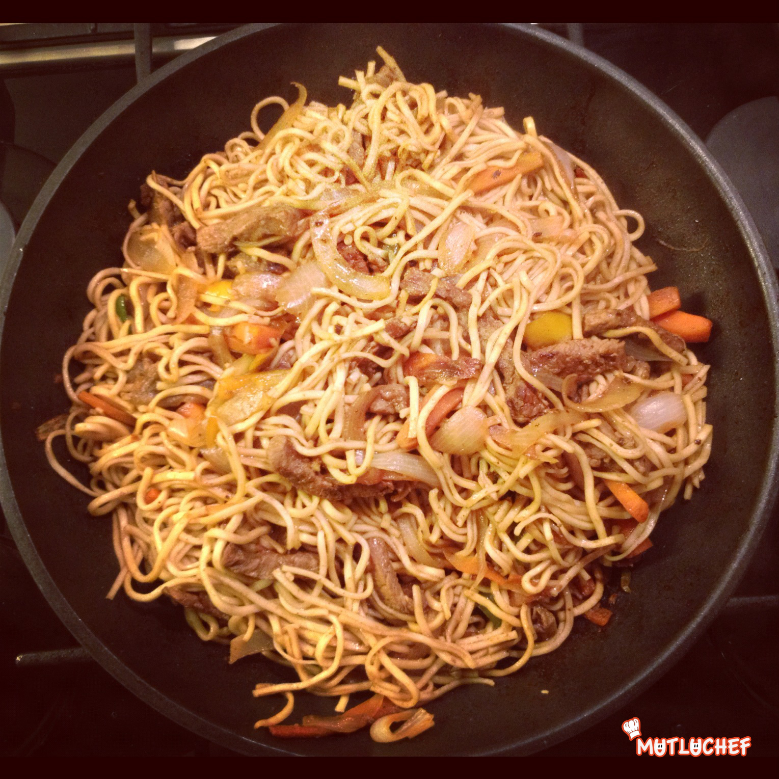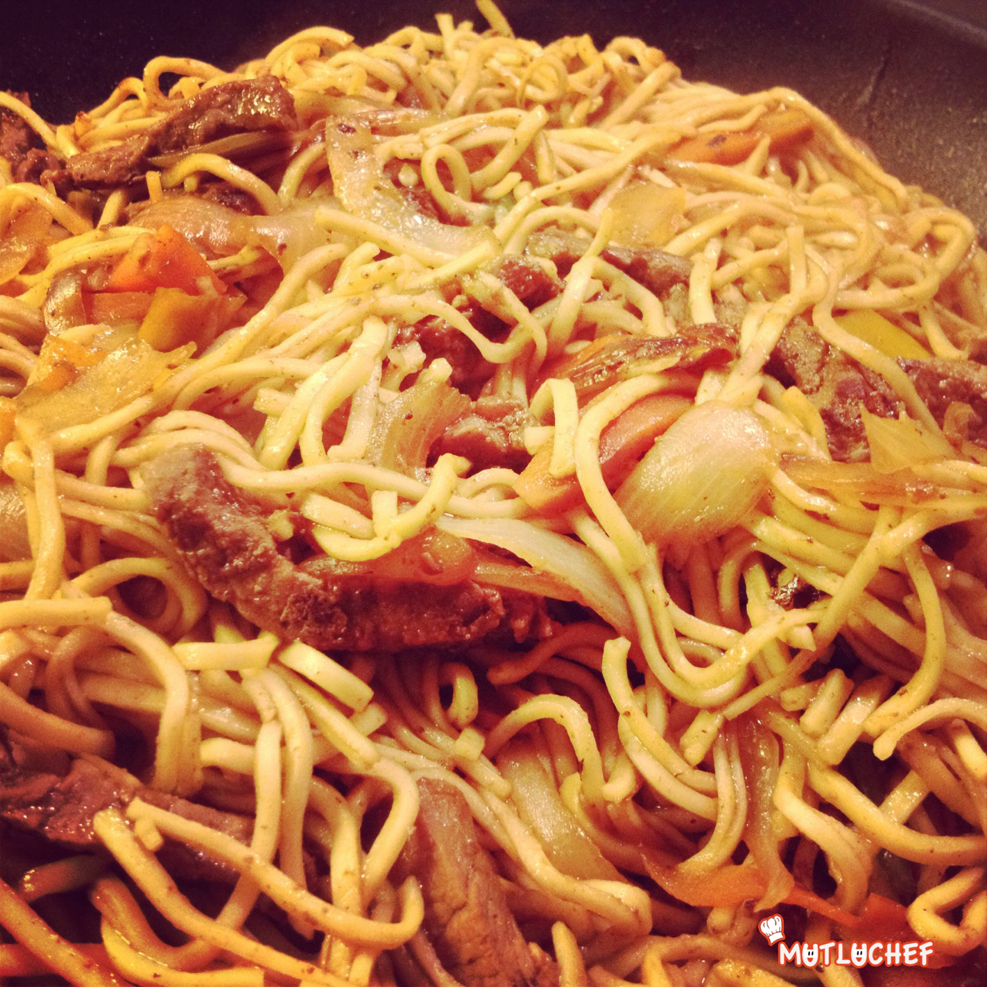 egg_noodleNoodle (Çin eriştesi) uzakdoğu mutfağının en popüler yemeklerinden bir tanesi… Tüm çeşitlerini keyifle yediğimiz için fırsat buldukça evde de yapıyorum. Bu yemek için her markette kolaylıkla bulabileceğiniz genellikle 350 gr.lık paketlerde  6 parça şeklinde satılan noodle’dan kullandım. Noodle alırken dikkat etmeniz gereken şey  üzerinde yumurtalı yazması ve tabi ki son kullanma tarihi…( Yumurtalı olanların üzerinde Egg Noddle yazıyor). Eti ve tüm malzemeleri jülyen (ince ve kısa) biçimde doğrayın. Bu yemeği yapmak için derin ve geniş bir teflon tava veya wok tava kullanmak gerekiyor. Tavayı ısıtın. Aynı anda derin bir tencereye su koyun ve biraz tuz ekleyerek kaynamaya bırakın. Tava ısınınca  etleri atın ve renkleri dönene kadar çevirerek soteleyin. Etlerin suyunu bırakmaması için tavanın sıcaklığının sabit olmasına dikkat edin. Rengi dönen etlerinize havuçları ekleyin ve 5-6 dk.karıştırarak sotelemeye devam edin. Soğanları ekleyin ve karıştırın.