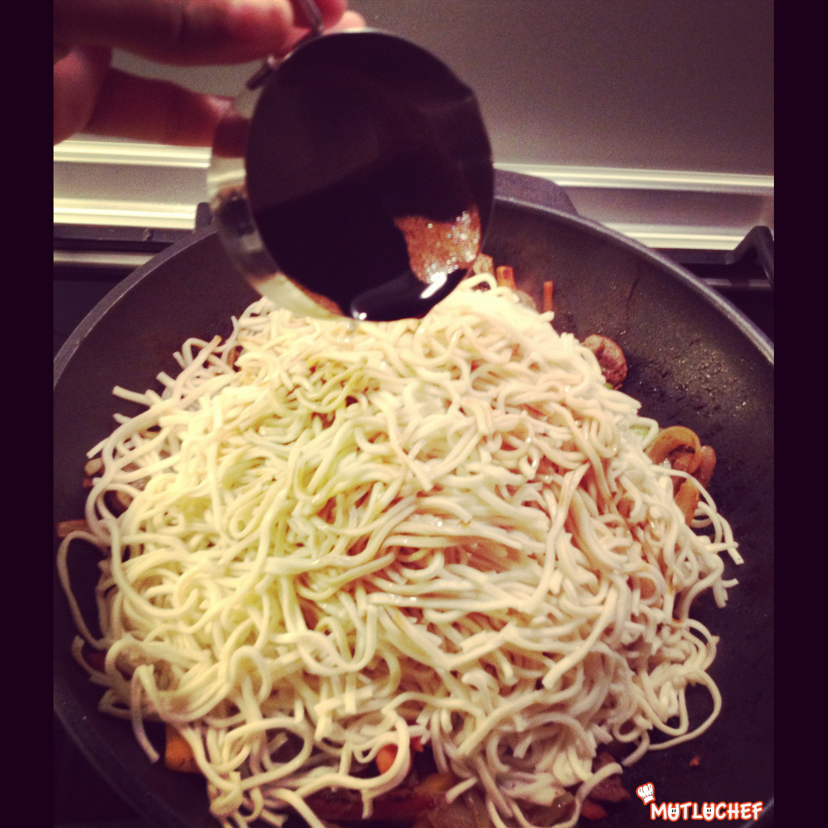 Yeterince haşlanan noodlelları maşa yardımıyla tencereden alın ve et ve sebzelerin olduğu tavaya aktarın. Tamamını aktardıktan sonra noodlelara soya sosunu ekleyin ve aşağıdan yukarı doğru karıştırarak soya sosunu ve tüm malzemeleri birbibirine karıştırın. Soya sosunu çekene kadar 1-2 dk. daha karıştırdığınız noodlelları, tavanızın altını kapatarak derin bir  tabakta (spagetti tabağı veya kasede) servis yapın.