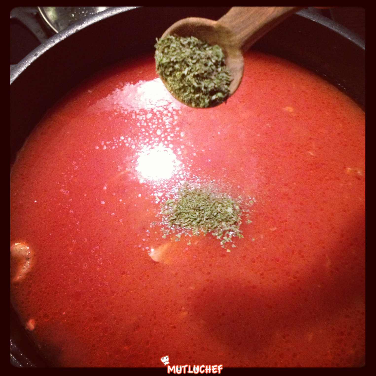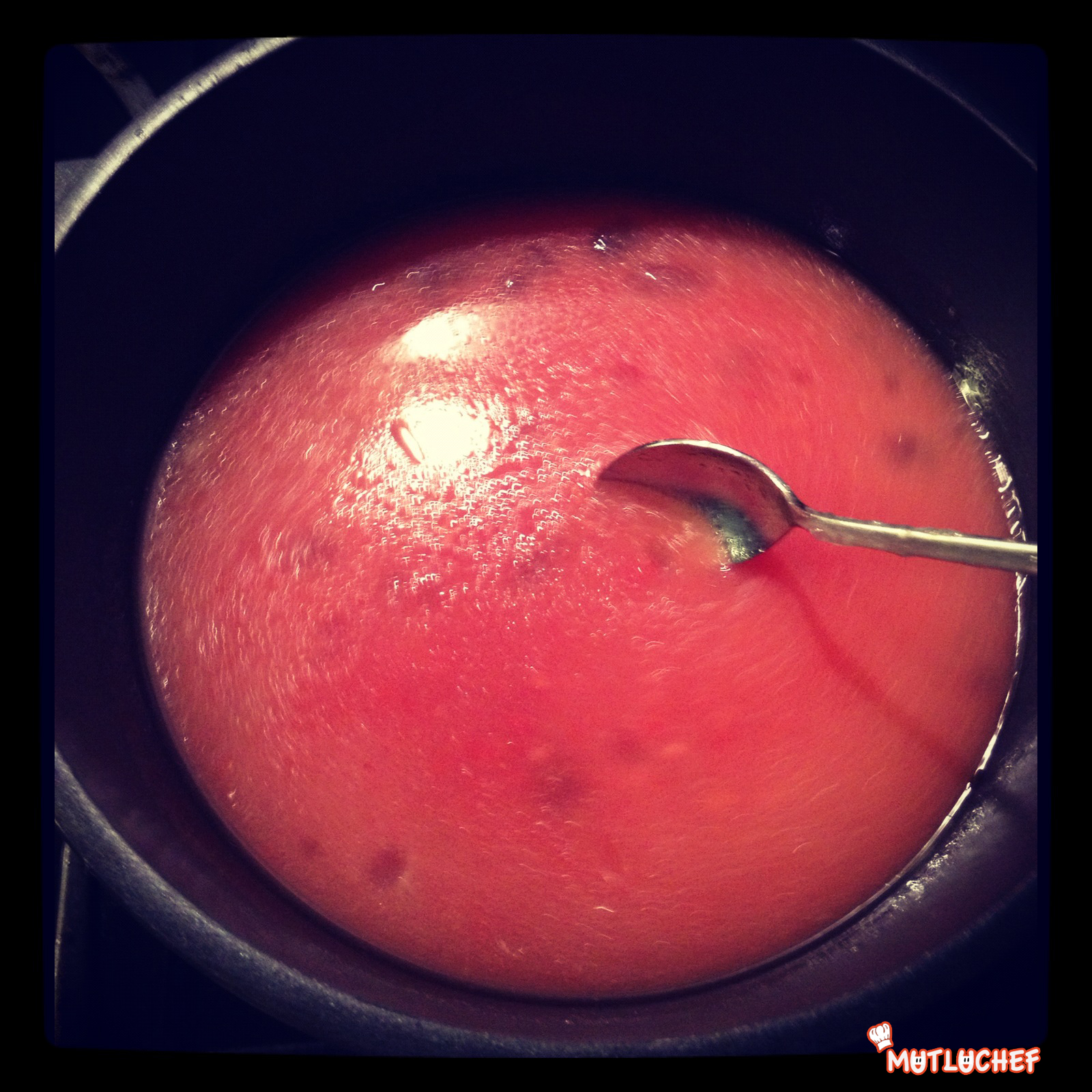 Tencereye rendelenmiş domatesi veya domates püresini koyun. Biraz ısınınca tavuk suyunu ve suyu ekleyerek kaynamaya bırakın. Domates salçasını biraz suyla açın ve kaynayan domatesli tavuk suyuna ekleyin. Dilerseniz salça koymayabilirsiniz. Ben renk vermesi ve aromasını artırmak için az da olsa koymayı tercih ediyorum.