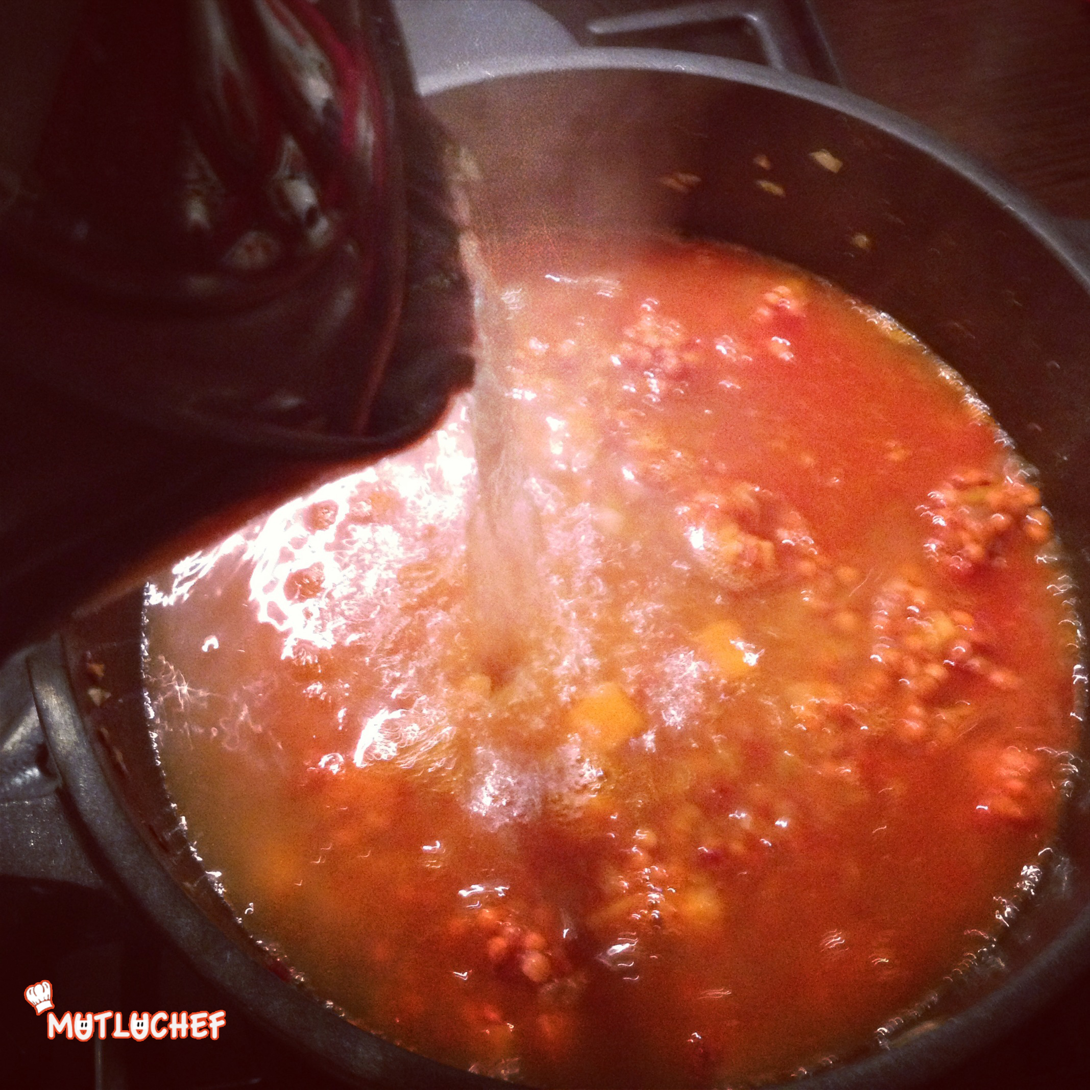 Salçaları ekleyerek karıştırın. 2 bardak et suyuna ilave olarak 2 bardak kadar da kaynamış suyu mercimeklere ekleyin ve ara ara karıştırarak kaynatın. Mercimekler iyice yumuşayınca dağılarak suya karışacak ve çorbanız rengini almaya başlayacaktır.