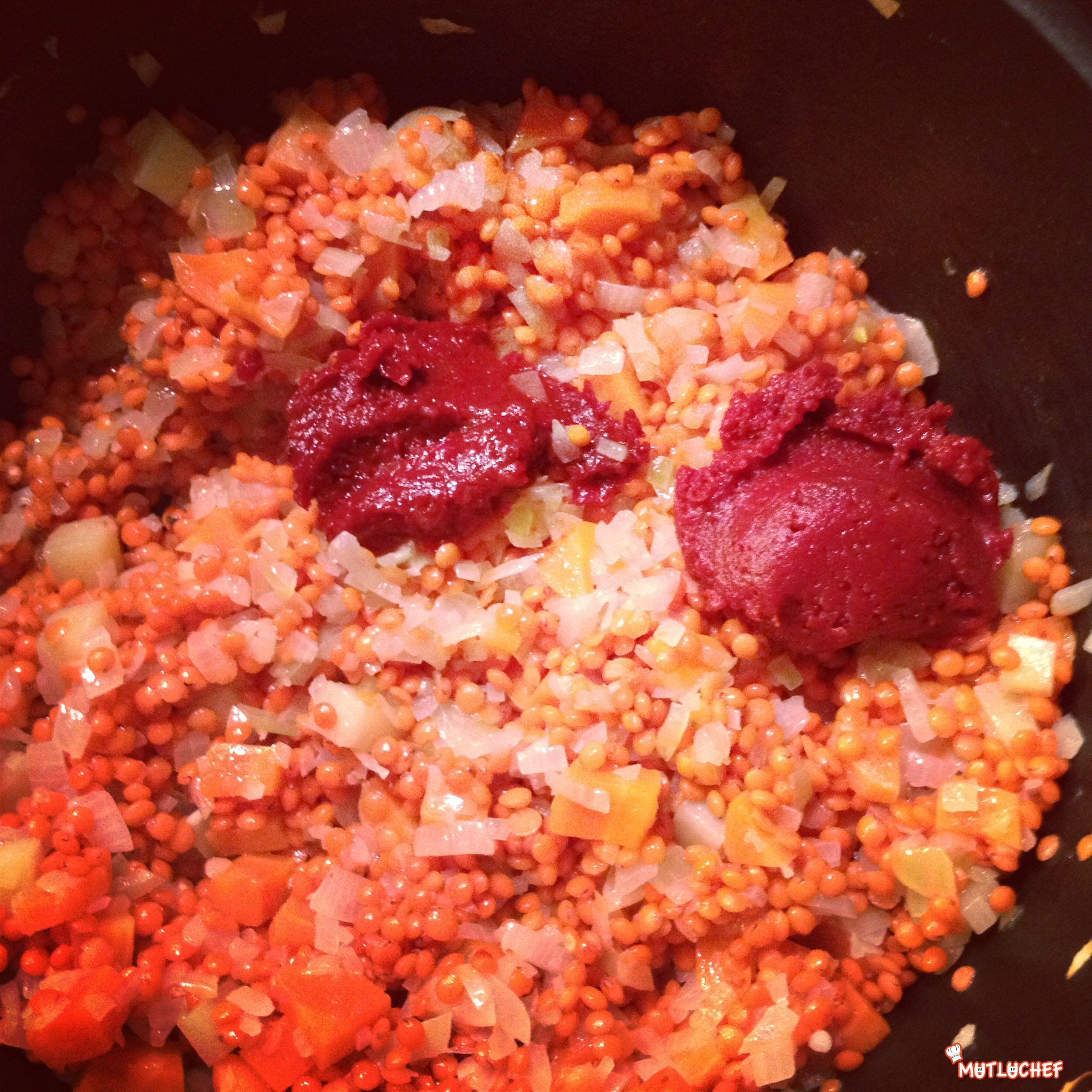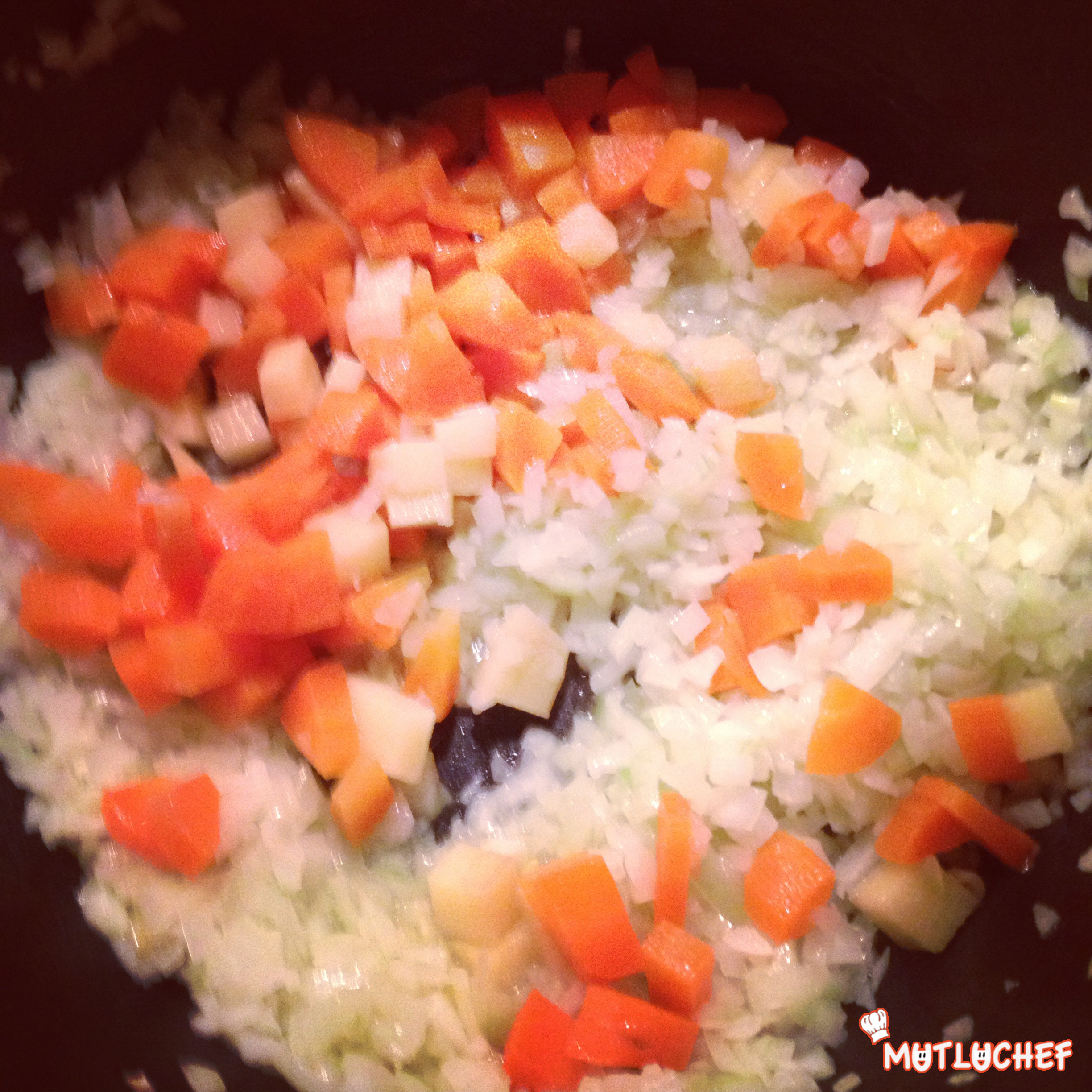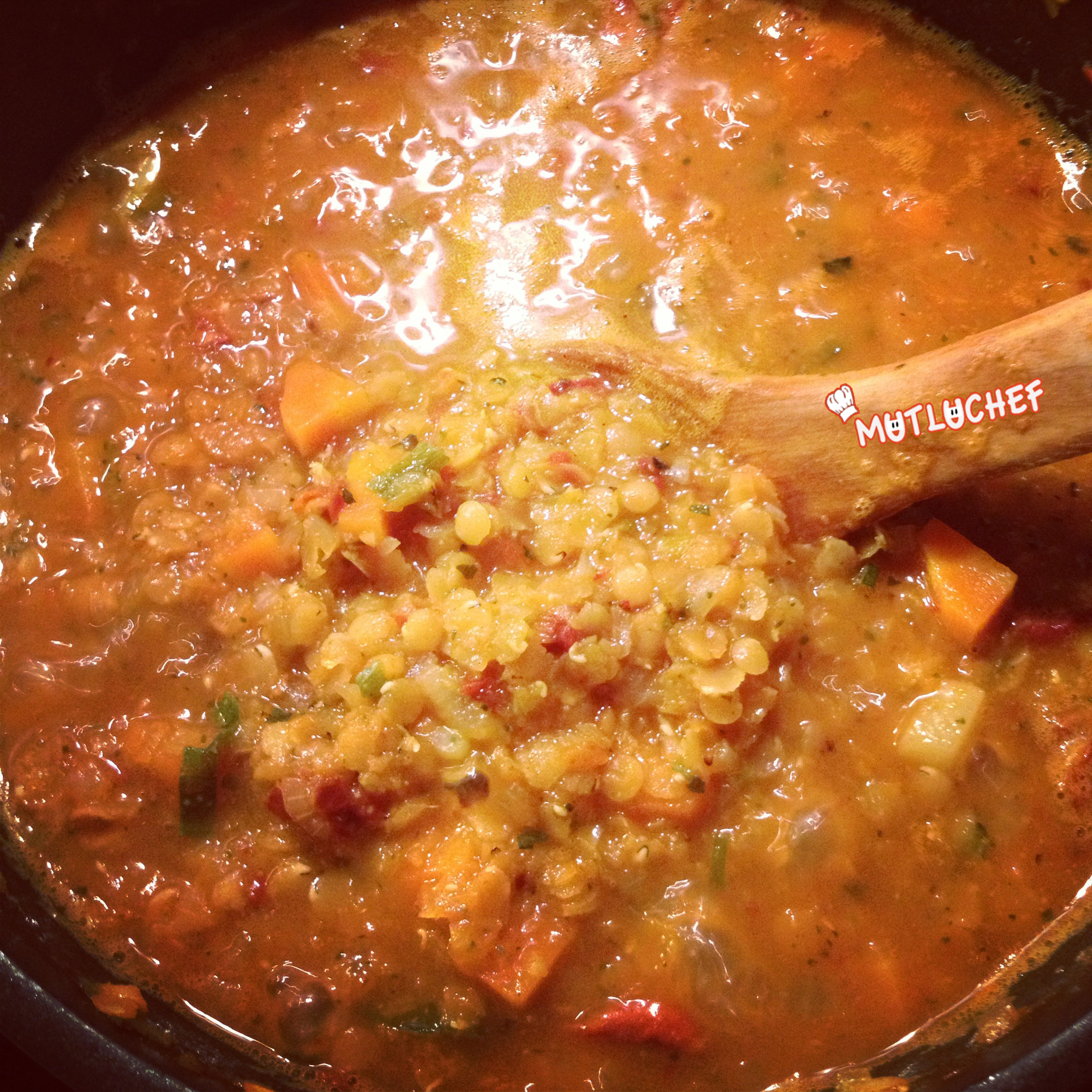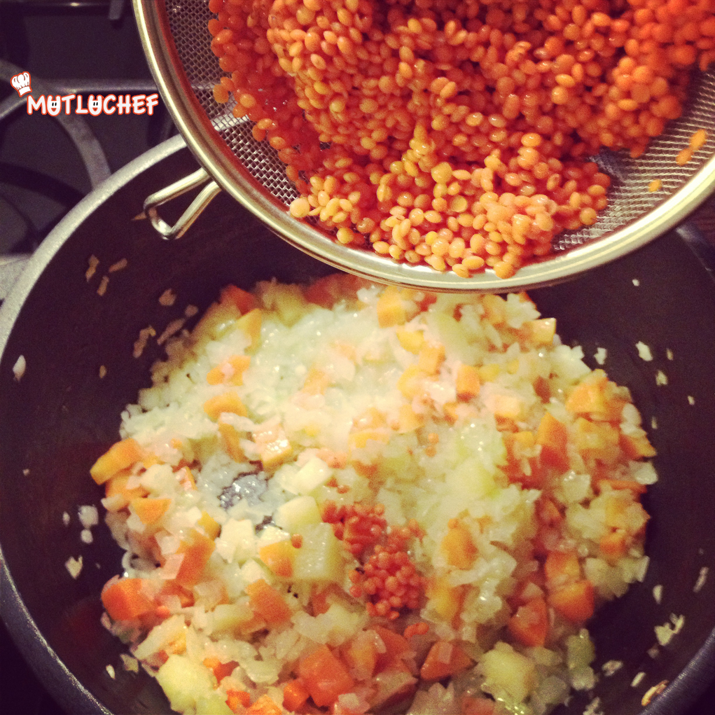 Soğanı patatesi ve havuçları küçük küçük küpler şeklinde doğrayın. Mercimeği bol suyla yıkayın ve süzülmeye bırakın. Tencereye sıvıyağı koyun. Sırasıyla, soğanları, havuçları ve patatesleri soteleyin. Sotelenen sebzelere suyu süzülmüş olan mercimekleri ekleyin ve sotelemeye devam edin.